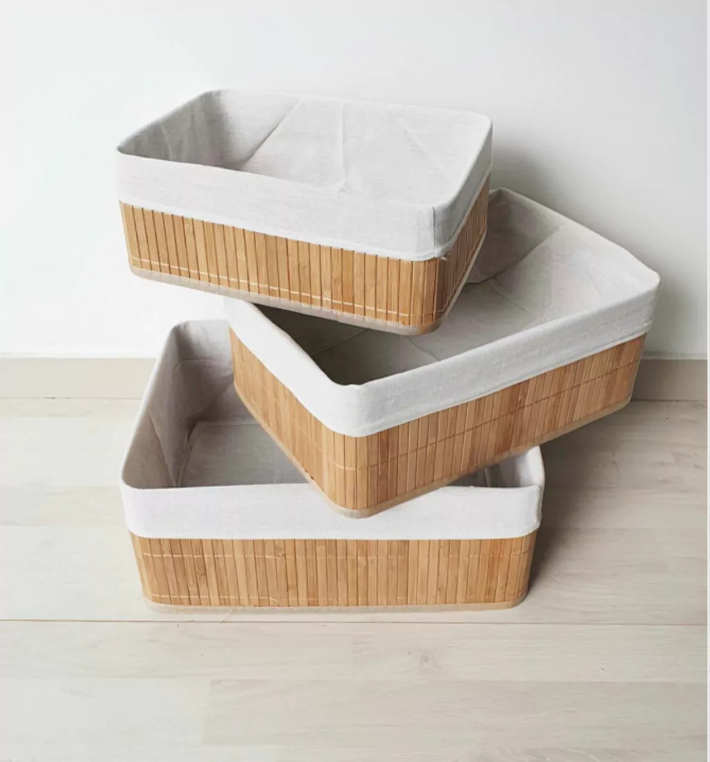 Cesto de bamboo rectangular con funda en color natural en su interior. Tres medidas disponibles.