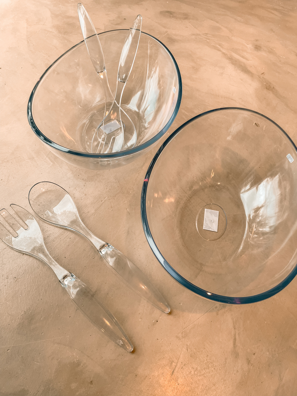 Ensaladera cuadrada con cubiertos acrilico. Medida 30x25x10 ensaladera y cubiertos 30 cms de largo.