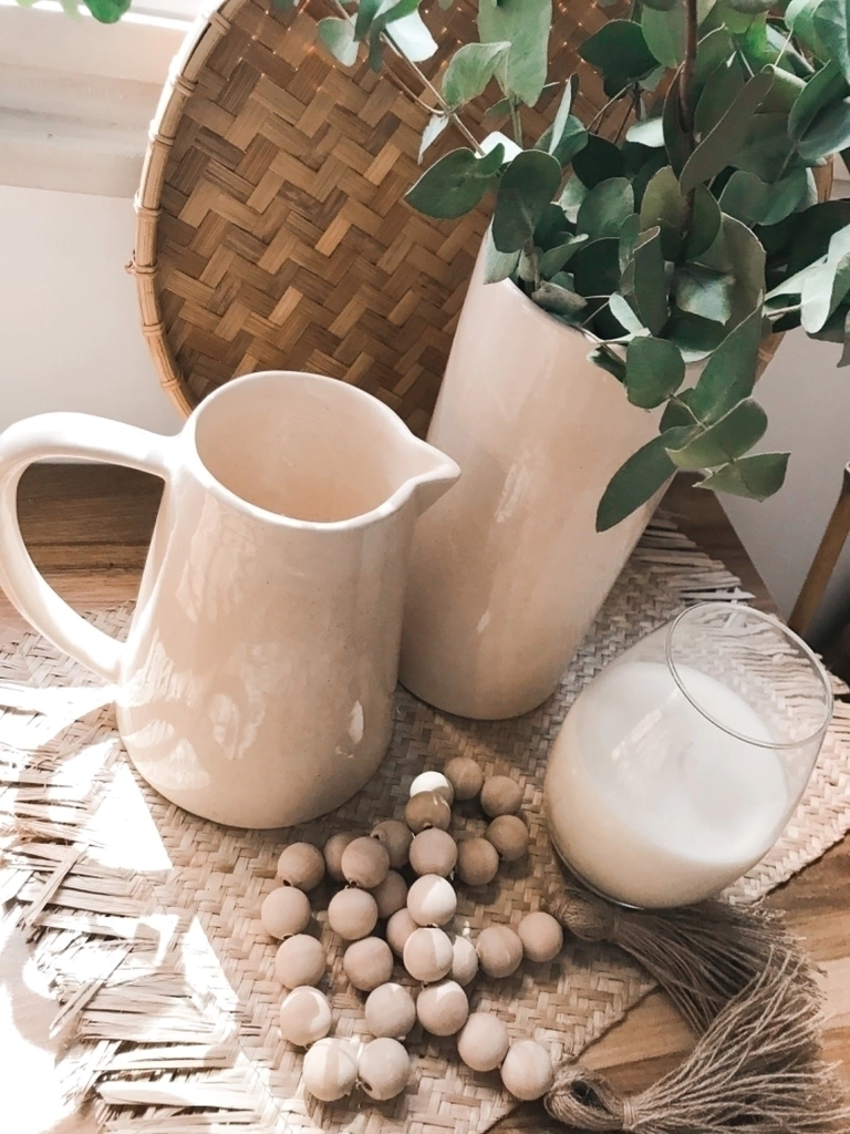 Jarra de cerámica color natural. Medidas 19 cms de alto, 15 cms de diámetro y 18.5 cms de ancho con asa.