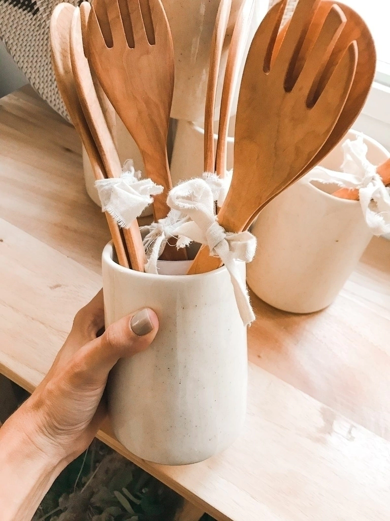 Florero, jarrón o portautensillos de cerámica natural, con delicados destellos dorados. Hecho a mano, cada pieza es diferente y puede presentar irregularidad en su textura. Medida 14 cms. de alto, 12 cms de diámetro de boca.