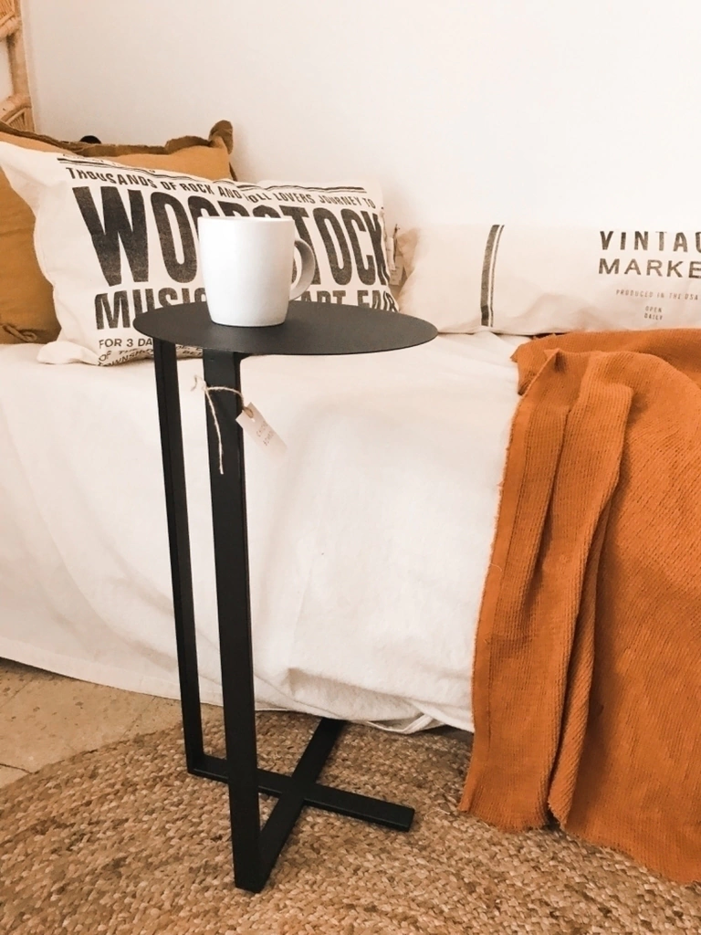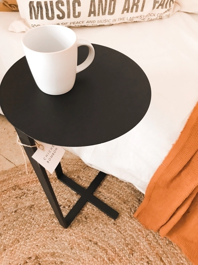 Mesa de chapa y planchuela, terminación pintura epoxi negra. Medidas 30 cms de diámetro y 60 cms de alto.