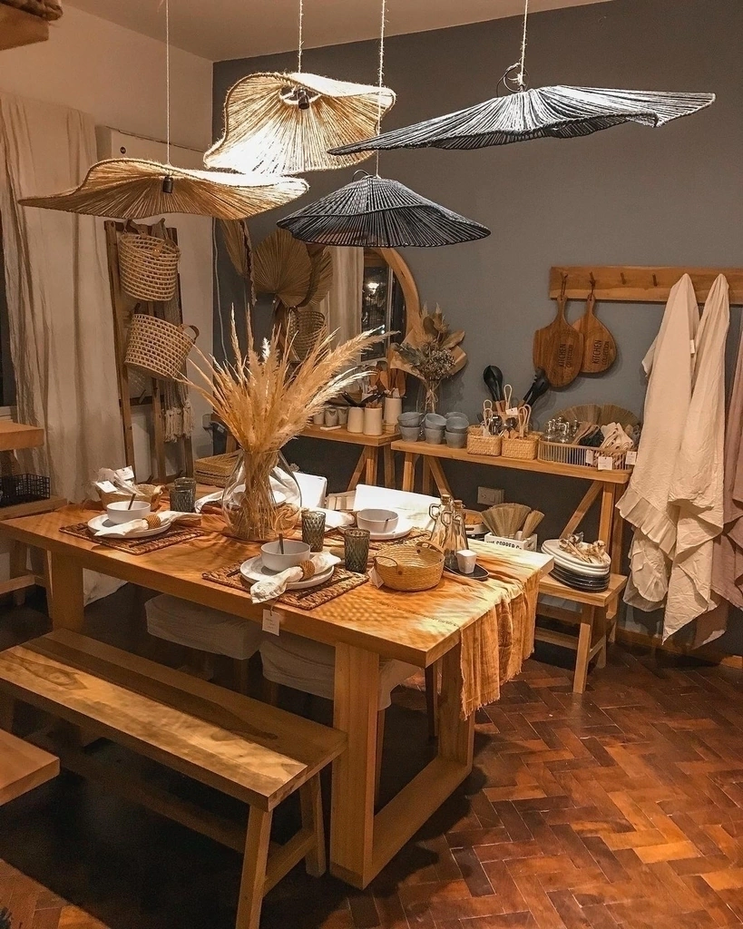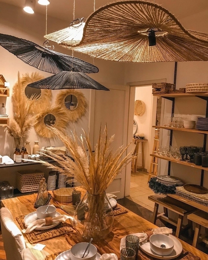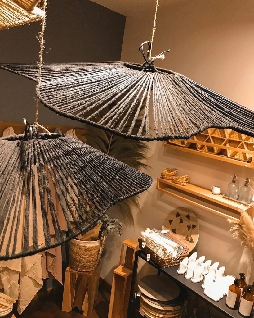 Pantallas Orgánicas estructura e hierro color negro, tejidas a mano. Incluyen cableado eléctrico. Hiladas en yute, hilo de algodón o ktaft.