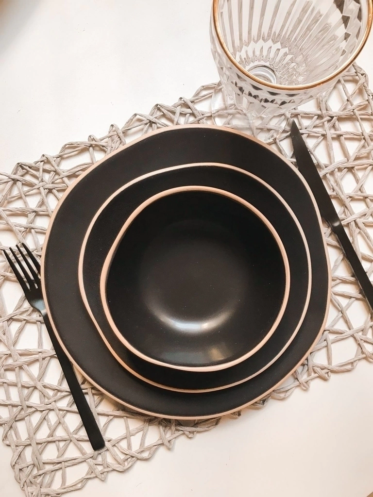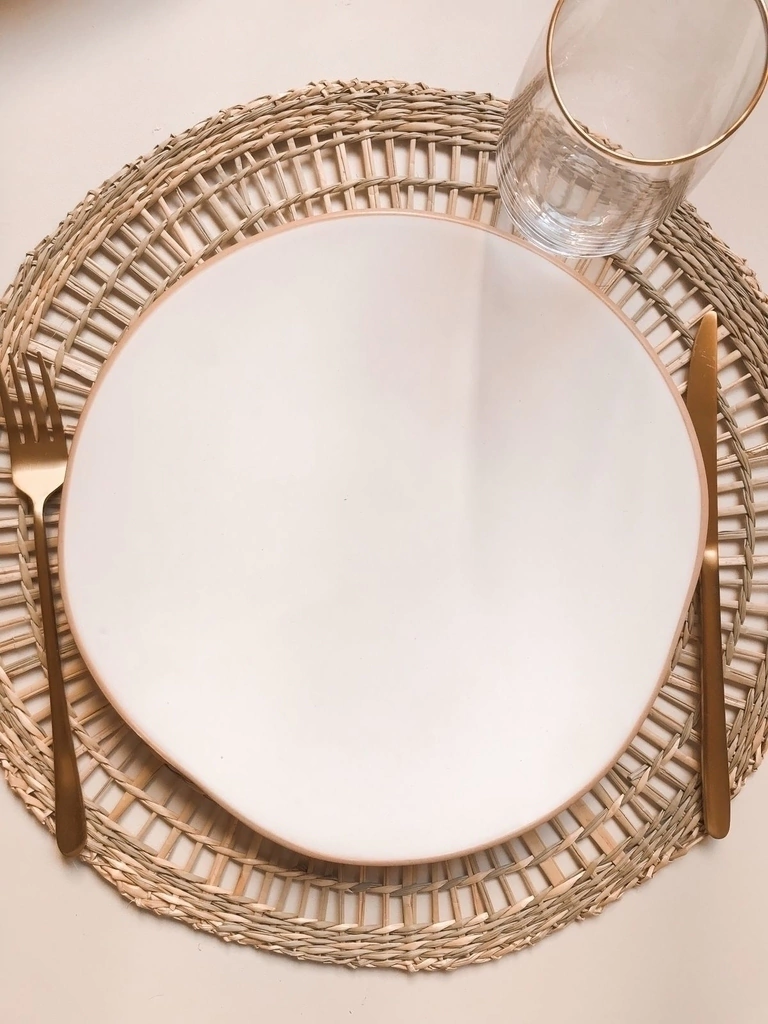 Plato de cerámica tipo satinada texturada, sin borde y bies color arena. Medida 26 cms de diámetro.