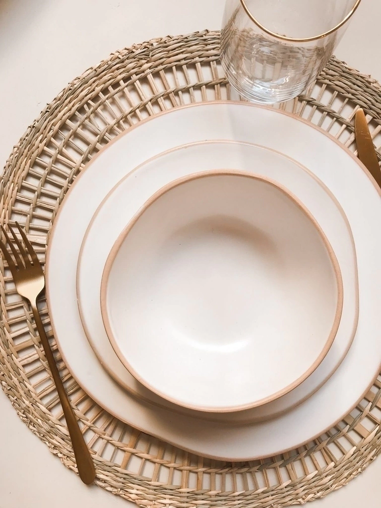 Plato de cerámica tipo satinada texturada, sin borde y bies arena. Medida 20 cms de diámetro.