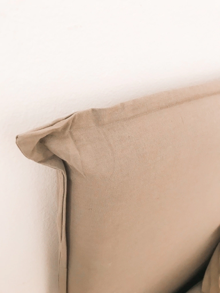 Respaldos de cama, estructura de madera, placa de goma de alta densidad, forro de fliselina que evita la humedad y funda tusor con bies expuesto. En la base, regatones plásticos para que la tela no toque directamente el piso. Medida 1.25 mts. de ato