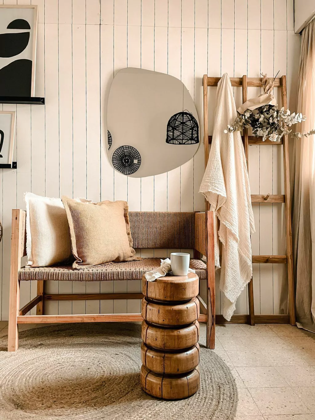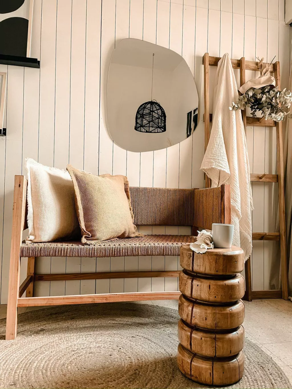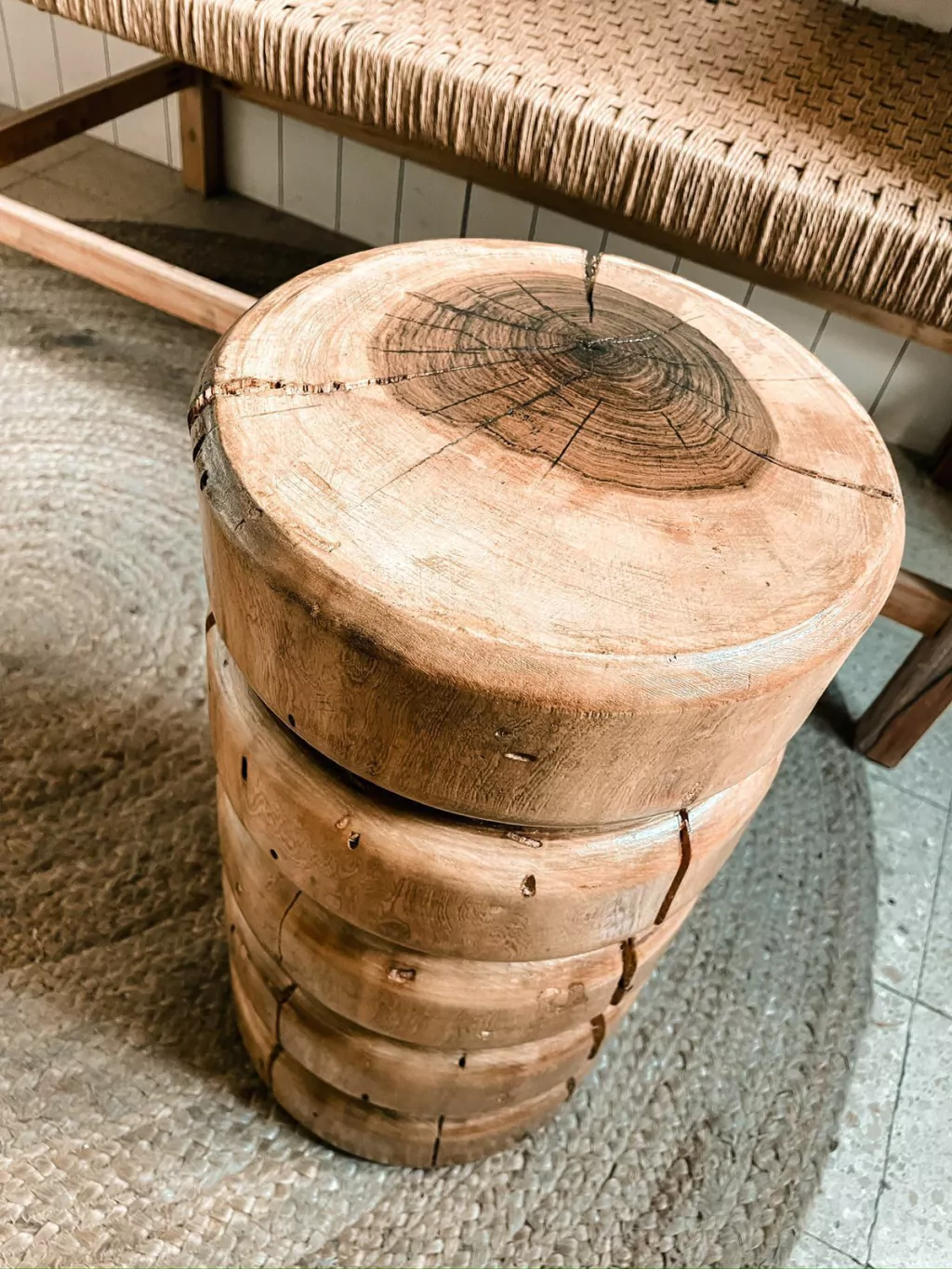 Bancos madera maciza torneada con terminación hidrolaca poliuretánica. Medida 25 cms diám y 45 cms alto.