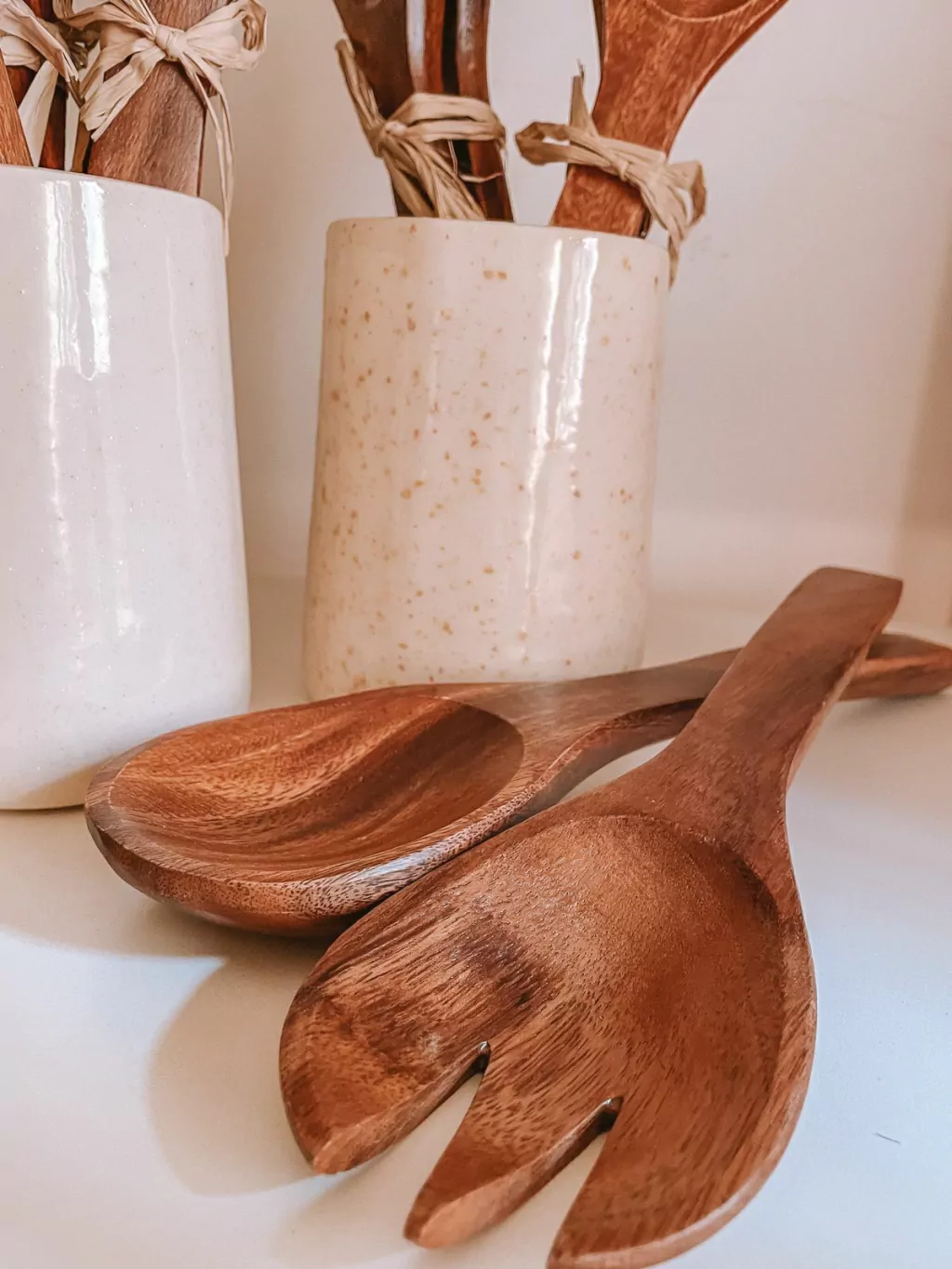 Set x2 unidades utensilios madera Acacia, tenedor y cucharón. Medida 30.5 cms de largo.
