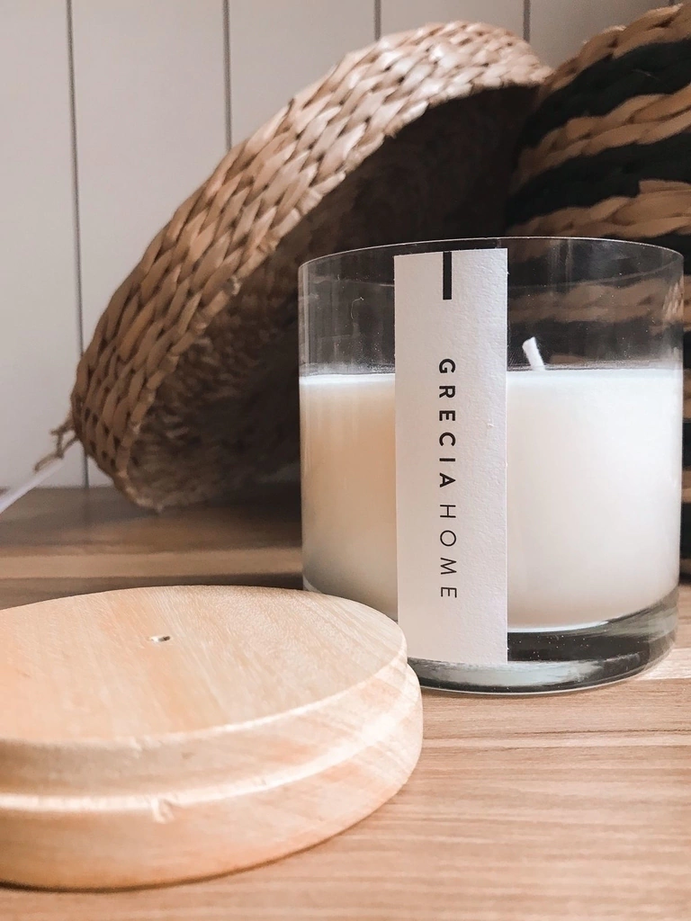 Vela aceite de soja. Vaso de vidrio 9 cms de diámetro, con 2 pabilos de algodón y tapa de madera maciza. Incluye packaging de presentación.